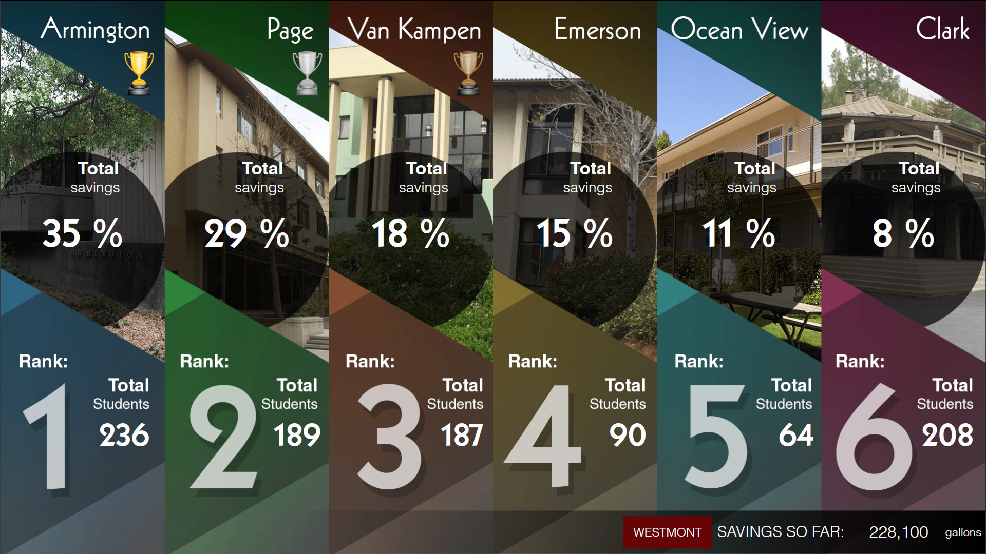 A friendly competition between Westmont residence halls has resulted in the savings of more than 227,000 gallons of water since students returned from spring break, March 17. The Westmont Campus Life and Student Life offices announced Armington Hall won the Every Drop Counts contest on April 25.