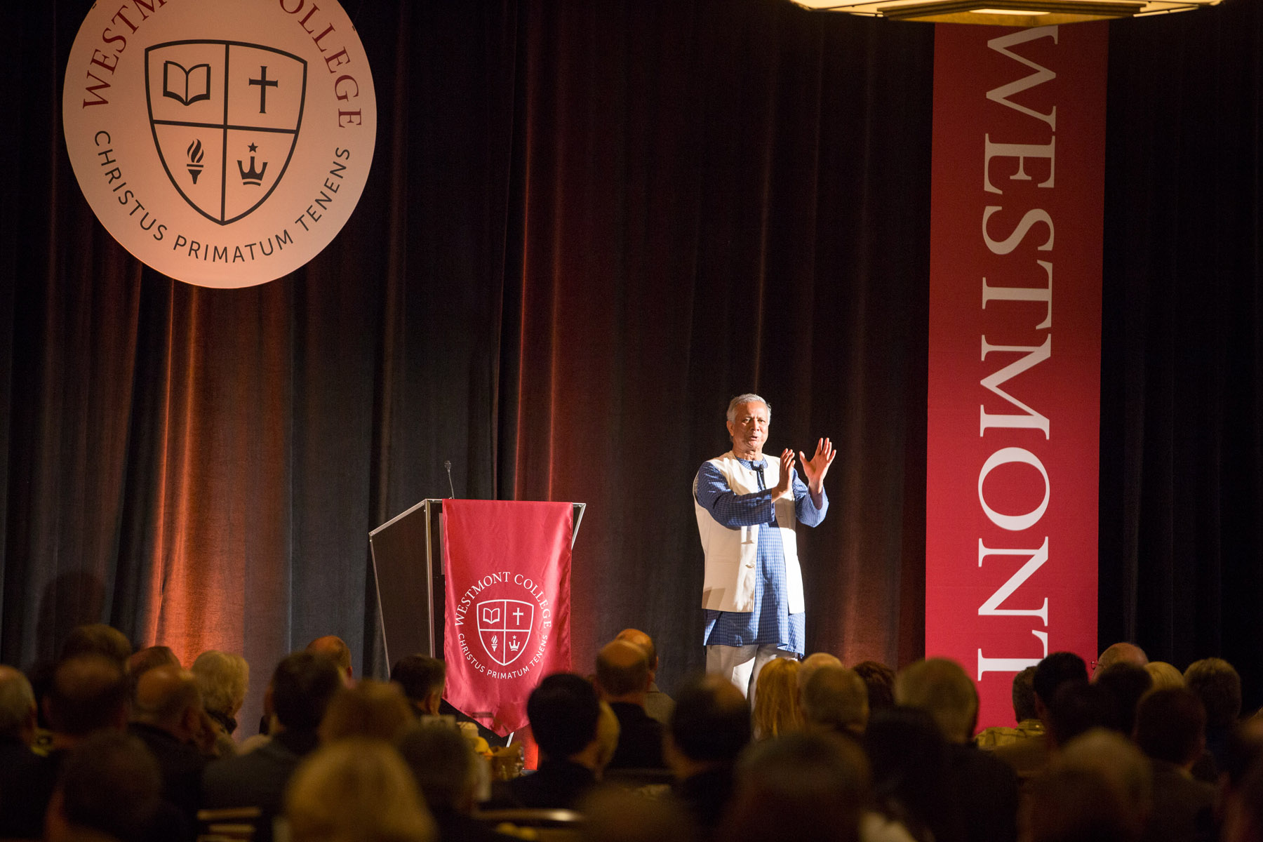 Beebe asked, “What allows millions of people over thousands of years to see abject poverty and simply accept it as a given? What causes a solitary individual, who has mastered complex economic theories, to feel utterly helpless and unable to meet immediate human needs and yet decide one day to do something to help?” He noted that Yunus’ time as a Fulbright Scholar in the U.S. shaped his life and spoke about the importance of providing global education for students at Westmont.PB14_0320